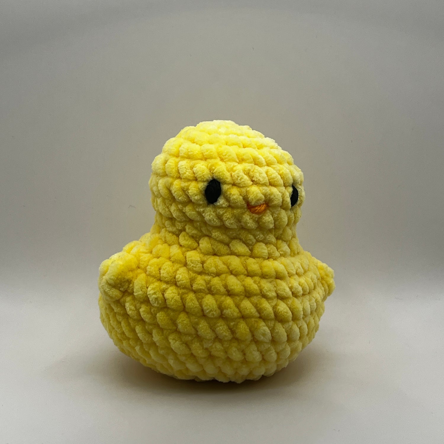 This handmade crocheted duck is a small plush figure, crocheted using chunky yarn for a soft, rounded shape. Each duck is made by hand, so slight variations in shape and stitching are part of the handmade process.